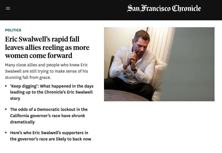 Within days of publication, Swalwell had lost two dozen congressional endorsements, the support of the California Teachers Association, and his campaign chairman. Then he lost his seat.