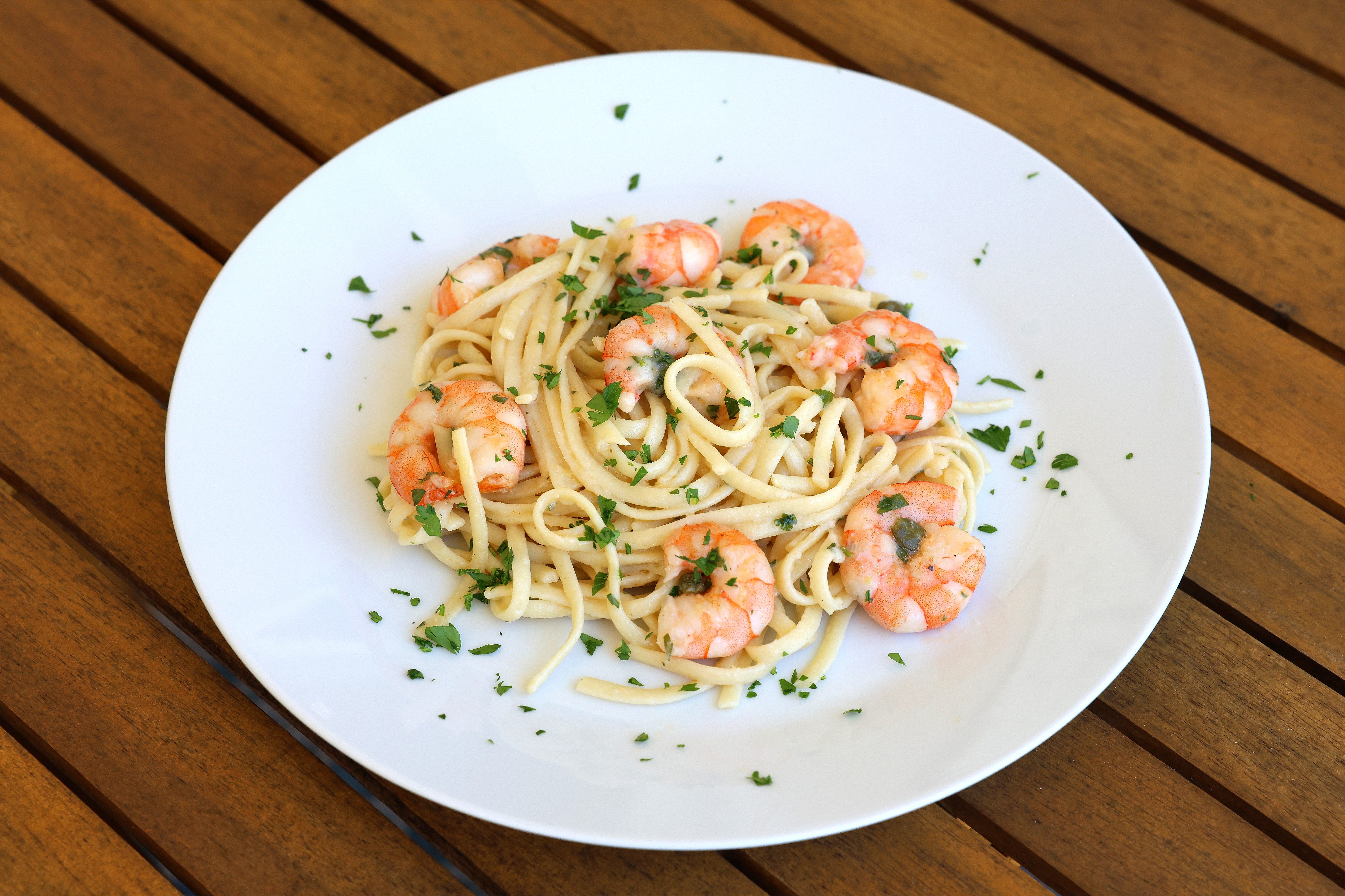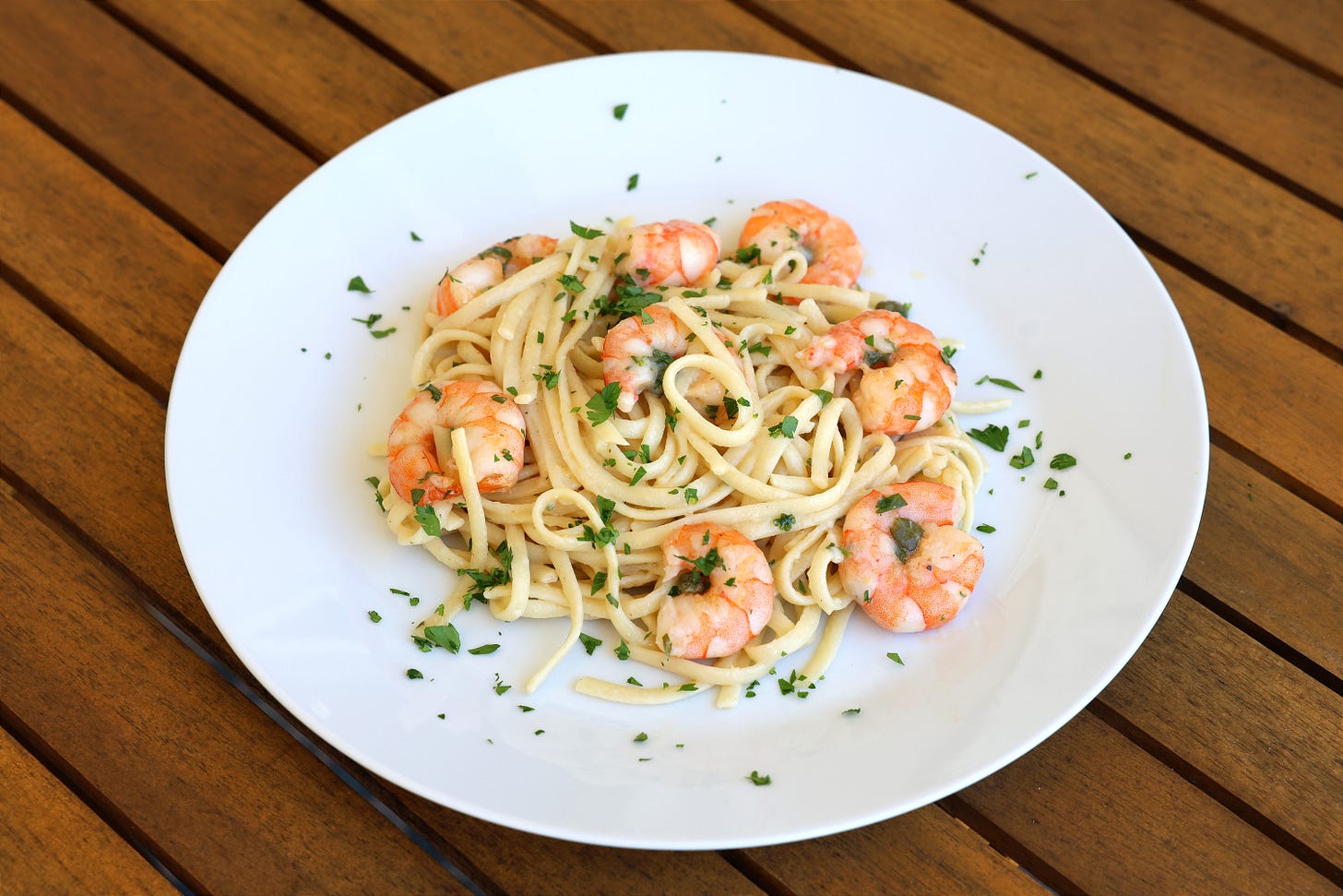 From there, it’s layer after layer. Butter and olive oil build a base. Shrimp adds sweetness and texture. Garlic brings heat and fragrance. White wine lifting it. Lemon zest and juice cuts through and brightens everything. Parmesan emulsifying with starchy pasta water into something glossy and cohesive. Parsley coming in at the end, fresh and green, tying it together.