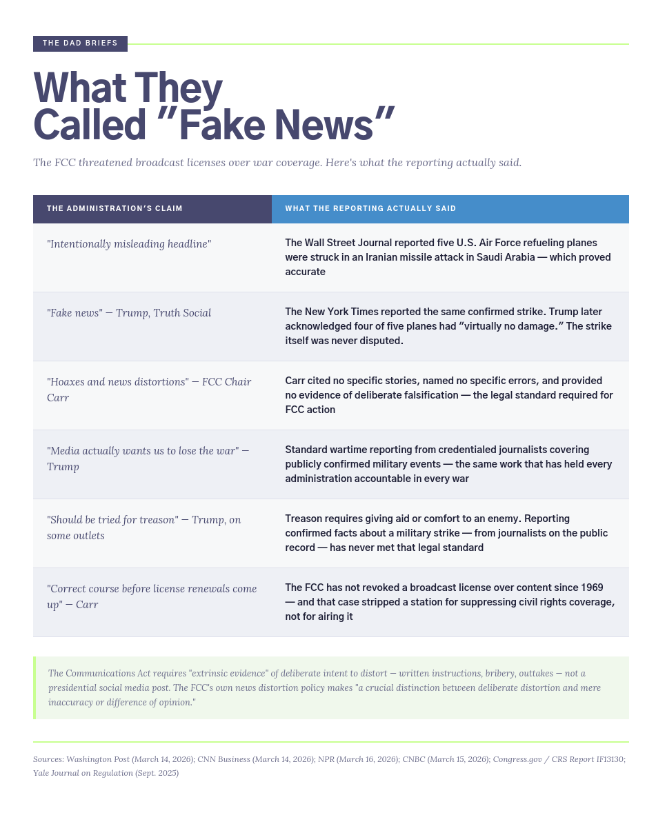 Let’s be precise about what just happened: the United States government threatened to strip broadcasters of their licenses if their war coverage didn’t align with the president’s account of events. And it did so while the war was still ongoing.