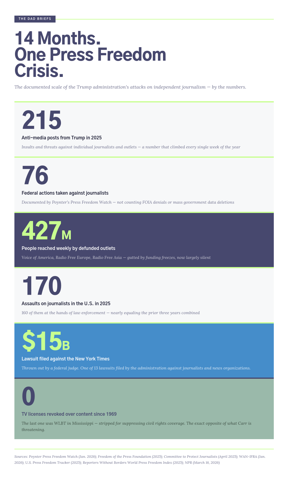 By the numbers, compiled by Poynter’s Press Freedom Watch: 215 anti-media social media posts from Trump in 2025 alone. Seventy-six documented federal actions against journalists. Thirteen lawsuits filed by journalists and media organizations against the administration over press freedom violations.