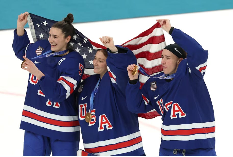 Three days earlier — Thursday, February 19 — the U.S. women’s hockey team also beat Canada in overtime to win gold. Also 2-1. Also in Milan. They finished the tournament undefeated, going 6-0, outscoring opponents 33-2 across seven games. They only allowed two goals the entire tournament.