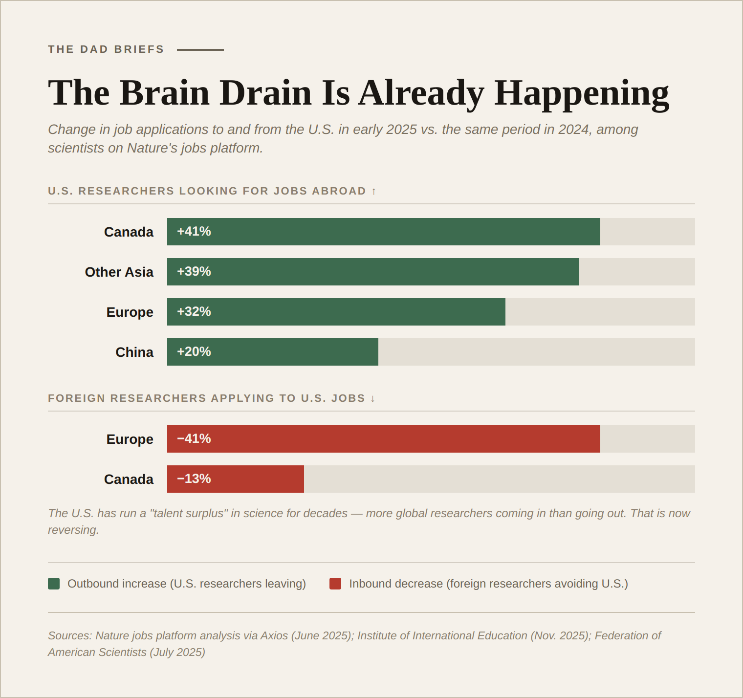 Institute of International Education (Nov. 2025): 17% drop in new international student enrollment. Nature poll (2025): 75% of 1,600 scientists considering leaving the U.S. STAT News (Dec. 17, 2025); Axios (June 7, 2025); The Week (March 28, 2025); Federation of American Scientists (July 2025). European Research Council applications from U.S.-based researchers nearly tripled.