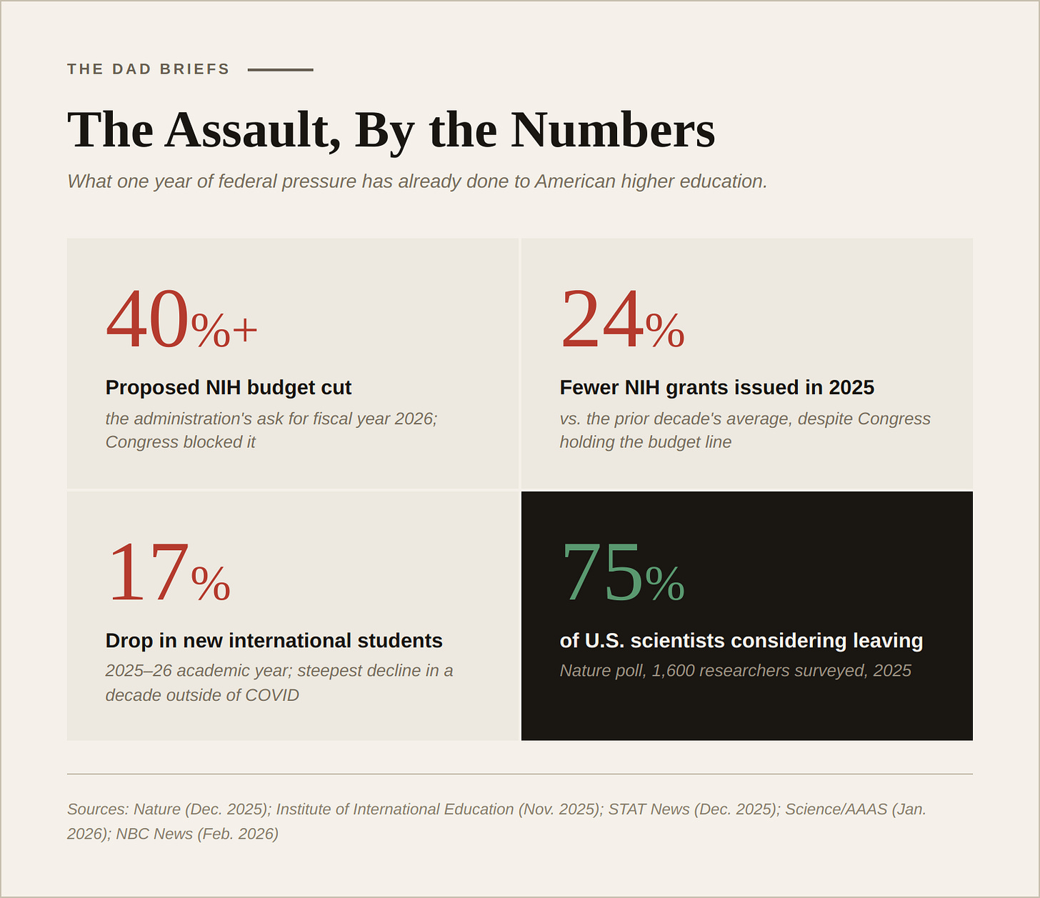 STAT News (Dec. 4, 2025); NBC News (Feb. 6, 2026); Science/AAAS (Jan. 2026); Nature (Dec. 2025); Inside Higher Ed (Feb. 9, 2026). The Trump administration proposed a 40%+ NIH cut and a ~57% NSF cut. Congress passed a bill with a $415M NIH increase. The NIH issued approximately 24% fewer grants in 2025 vs. the prior decade average.
